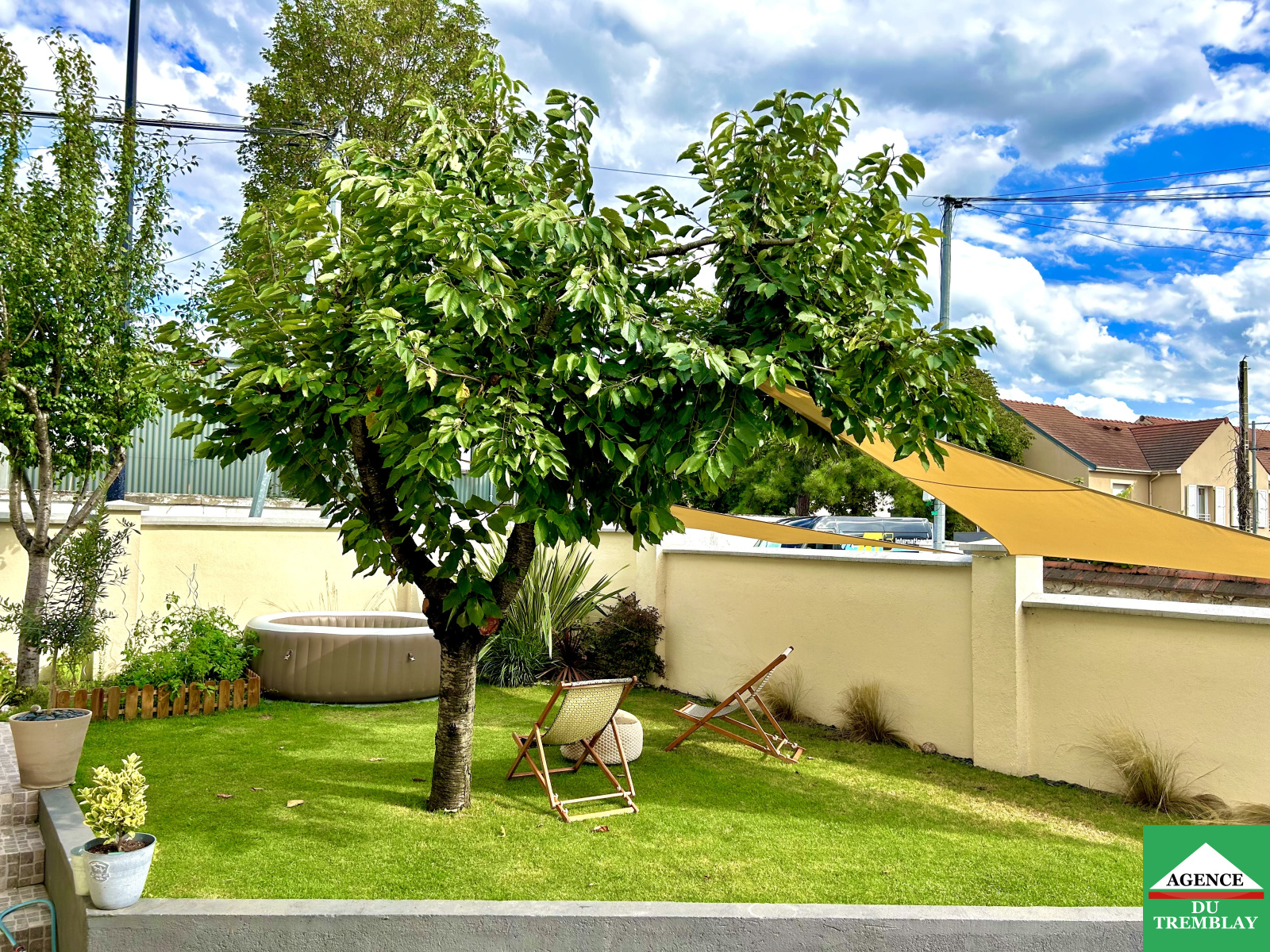 Un beau jardin et un garage + stationnement 2 voitures sur l'allée.